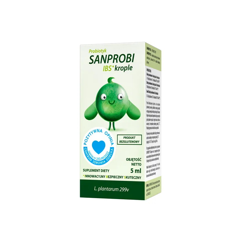 Sanprobi IBS - to suplement diety w postaci kropli zawierający w składzie L. plantarum 299v. Produkt przeznaczony dla dzieci powyżej 1. roku życia i dorosłych.