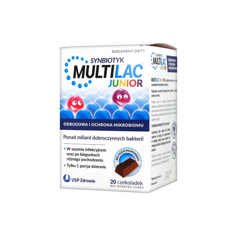 Multilac Junior - to suplement diety dla dzieci powyżej 3. roku życia. Preparat jest połączeniem probiotyku i czekolady.