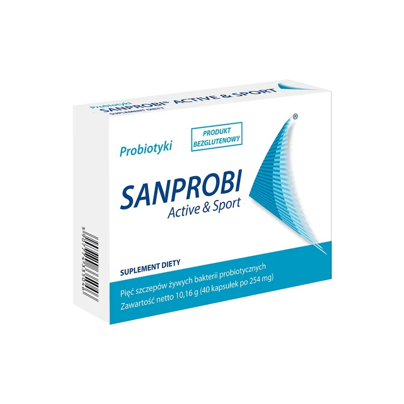 SANPROBI ACTIVE & SPORT - suplement diety zawierający unikalną kompozycję pięciu szczepów bakterii probiotycznych. Produkt przeznaczony dla osób dorosłych.