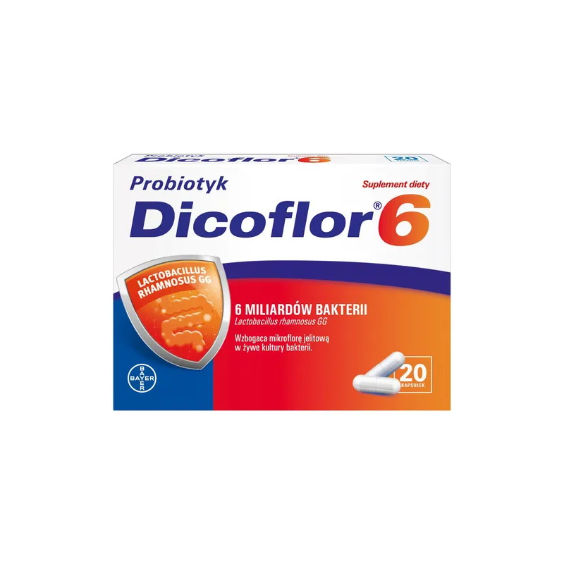 Dicoflor 6 - suplement diety zawierający w swoim składzie żywe kultury bakterii Lactobacillus rhamnosus GG (ATCC 53103). Produkt przeznaczony dla dzieci powyżej 3 roku życia i osób dorosłych.