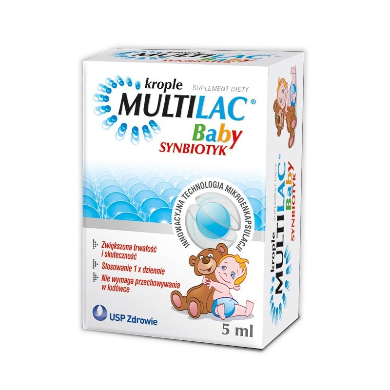 Krople Multilac Baby to suplement diety do stosowania w trakcie i po antybiotykoterapii u niemowląt, dzieci i dorosłych. Może być również stosowany przy osłabieniu mikroflory jelitowej lub w okresie jesienno-zimowym. Multilac Baby zawiera szczepy bakteryjne Lactobacillus rhamnosus GG oraz fruktooligosacharydy (FOS). Produkt nie wymaga przechowywania w lodówce, dlatego możesz zabrać go ze sobą np. w podróż bez obawy, że straci swoje właściwości.