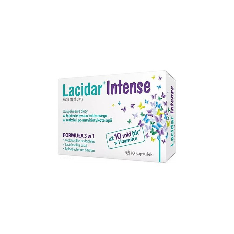 LacidarIntense to aż 10 miliardów bakterii kwasu mlekowego w 1 kapsułce. Preparat pomaga intensywnie i kompleksowo uzupełnić naturalną mikroflorę jelit w sytuacji wymagających dostarczenia z dietą dodatkowej ilości bakterii.