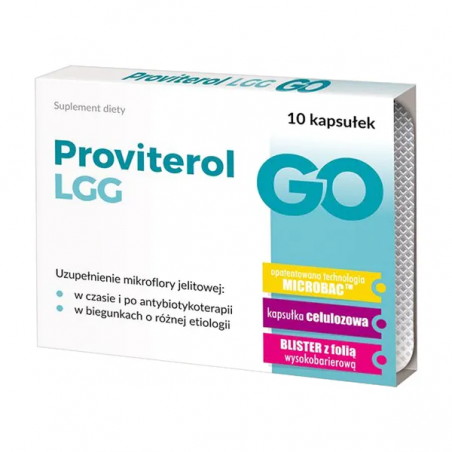 Proviterol LGG GO - suplement diety zawierający żywe kultury bakterii szczepu Lactobacillus rhamnosus GG. Produkt przeznaczony dla osób dorosłych,