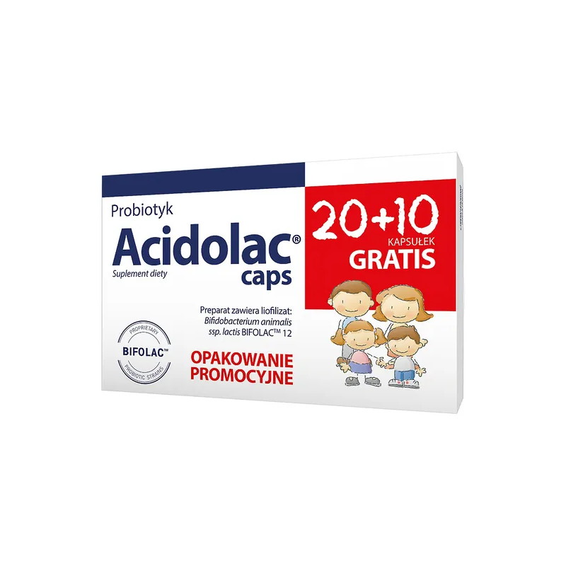 Acidolac caps - to suplement diety w postaci kapsułek, który zawiera liofilizowane kultury bakterii kwasu mlekowego Bifidobacterium animalis ssp. lactis BIFOLACTM 12. Produkt przeznaczony dla dzieci powyżej 6. roku życia i dorosłych.
