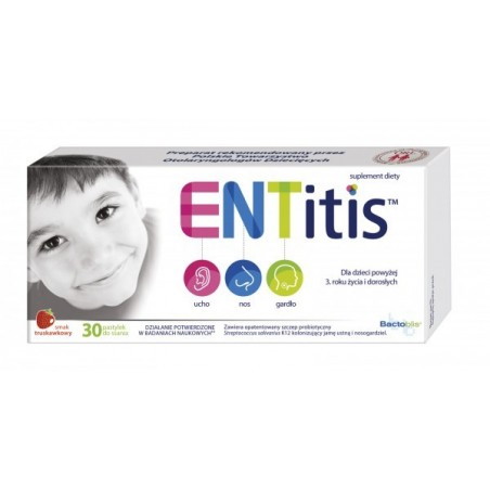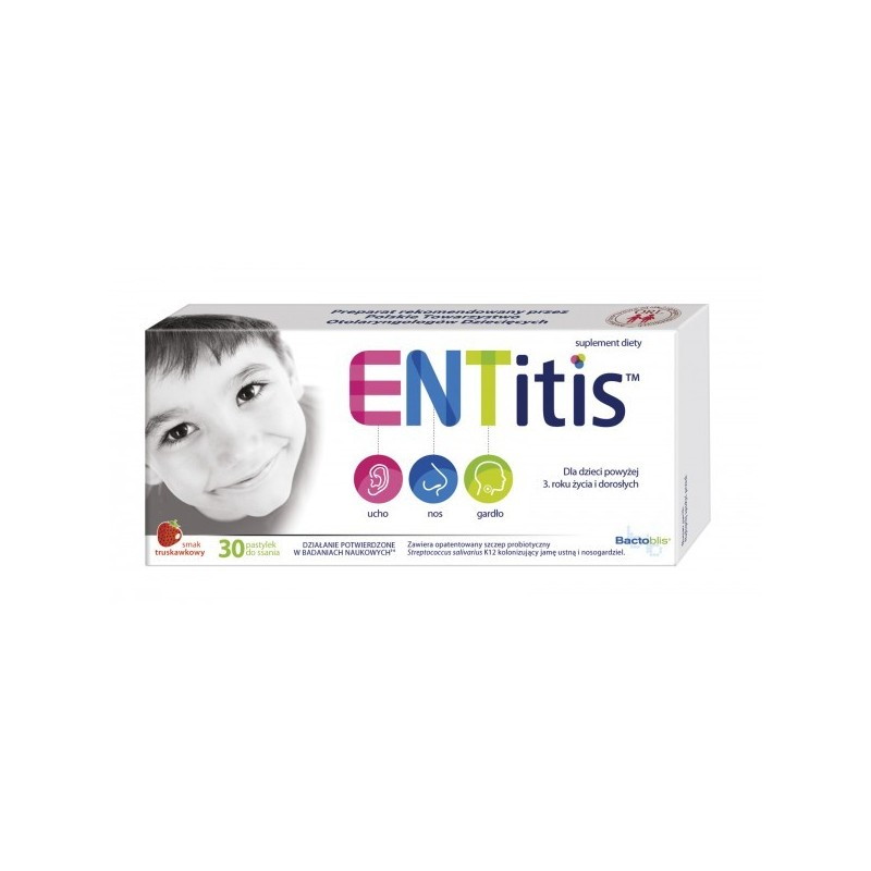 ENTitis - to suplement diety w postaci pastylek do ssania, który zawiera w swoim składzie Streptococcus salivarius K12. Produkt przeznaczony dla dzieci powyżej 3. roku życia i dorosłych.