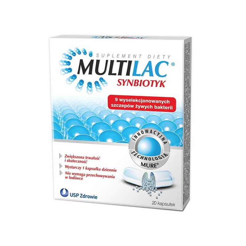 Multilac to suplement diety w kapsułkach, który zawiera w swoim składzie 9 starannie wyselekcjonowanych szczepów żywych bakterii probiotycznych. Związki te sprzyjają zachowaniu zdrowia w przewodzie pokarmowym, a dzięki zastosowaniu unikalnej technologii inkapsulacji cechuje je odporność na niskie pH soku żołądkowego oraz enzymy trawienne. Produkt nie zawiera mleka ani kazeiny, więc może być stosowany przez osoby uczulone na te składniki.
