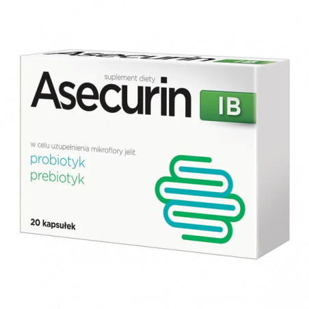 Asecurin IB - suplement diety, który stanowi połączenie probiotyku z prebiotykiem. Produkt zawiera szczepy bakterii probiotycznych i drożdże, które w naturalny sposób uzupełniają mikroflorę jelitową. Suplement diety posiada formę kapsułek celulozowych, które są odporne na soki żołądkowe i probiotyk dociera bezpośrednio do miejsca przeznaczania, czyli do jelit. Asecurin IB można stosować w celu uzupełnienia mikroflory jelitowej. Produkt przeznaczony dla osób dorosłych i dzieci powyżej 3. roku życia.