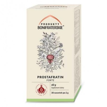 Prostafratin Forte to naturalna mieszanka ziołowa sporządzona zgodnie z zakonną recepturą, w postaci ekspresowych saszetek do zaparzania, zawierająca wierzbownicę wspomagającą prawidłowe funkcjonowanie prostaty, oraz skrzyp, perz, pokrzywę i pietruszkę – składniki wspomagające pracę nerek.