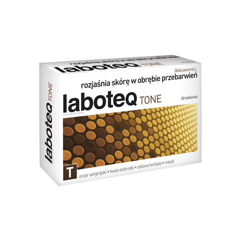 Laboteq TONE - suplement diety zawierający wyciągi roślinne, miedź oraz witaminy i składniki mineralne wspomagające utrzymanie prawidłowej pigmentacji skóry. Produkt przeznaczony dla osób dorosłych.