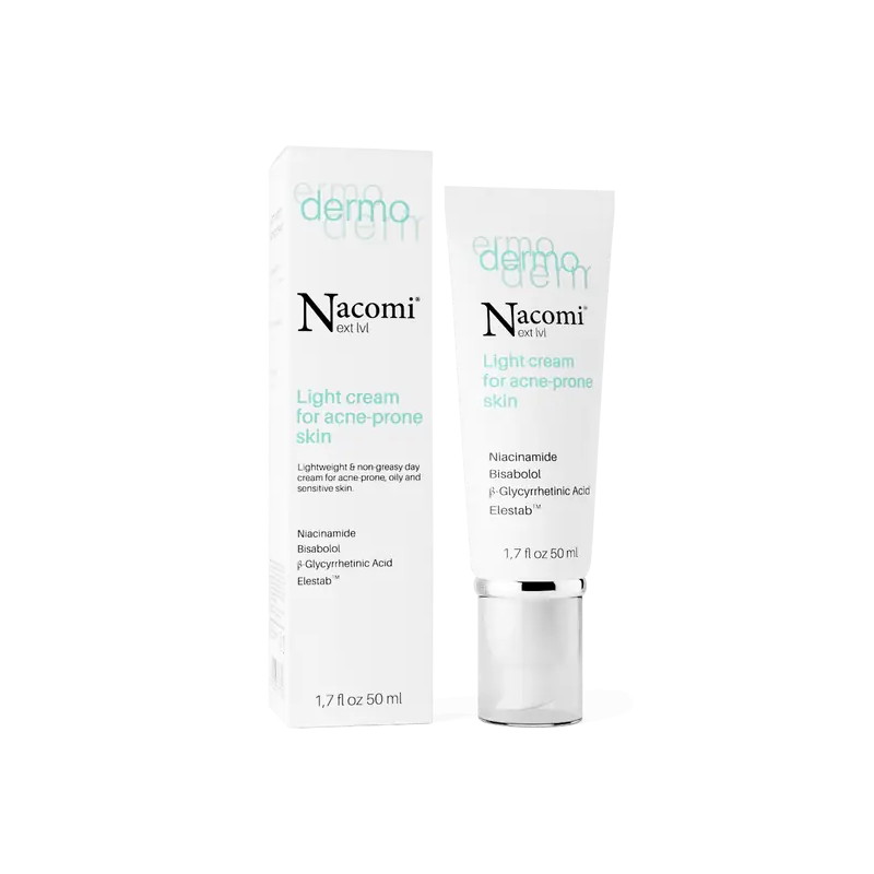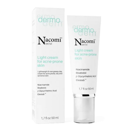 Nacomi Next Level Dermo lekki krem do cery trądzikowej, 50 ml wyróżnia się lekką konsystencją i szerokim spektrum działania, dzięki czemu nie tylko nawilża i regeneruje skórę, ale także redukuje jej niedoskonałości i reguluje wydzielanie sebum.