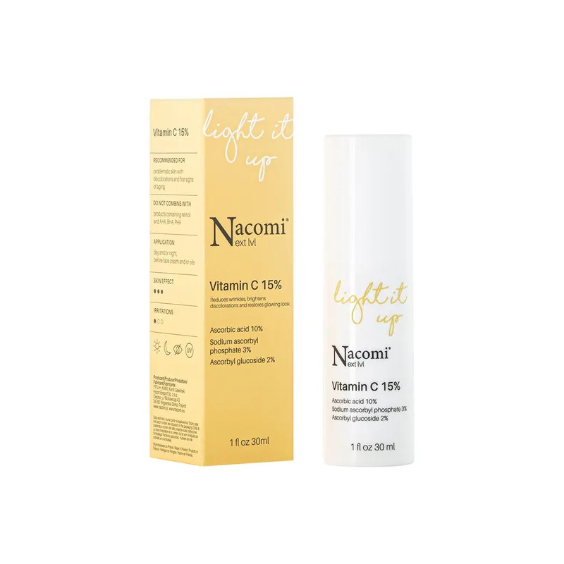Serum z witaminą C 15% Nacomi Next LVL sprawdzi się zarówno w pielęgnacji cery trądzikowej, jaki i dojrzałej czy też naczyniowej. Zawiera trzy formy witaminy C: kwas askorbinowy 10%, sól magnezową fosforanu askorbylu 3% oraz glukozyd askorbylu 2%, dzięki czemu poprawia koloryt skóry, dodaje jej blasku i chroni przed szkodliwym wpływem wolnych rodników. Witamina C znana jest z szerokiego spektrum działania. Dzięki działaniu przeciwzapalnym wspiera walkę z trądzikiem oraz zmniejsza podrażnienia. Jest również stosowana w pielęgnacji anty-age ze względu na silne działanie antyoksydacyjne oraz zdolność do pobudzania syntezy kolagenu.