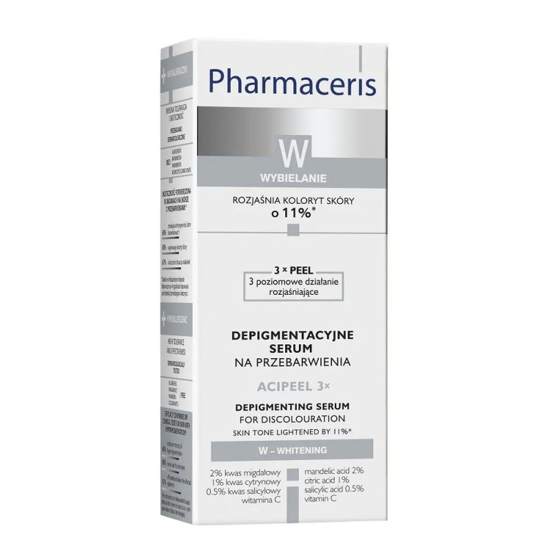 Skoncentrowana receptura serum oparta na unikalnej kompozycji 3 kwasów i biologicznie aktywnej witaminy C oddziałuje trzypoziomowo na proces melanogenezy, hamując powstawanie, redukując i rozjaśniając istniejące przebarwienia. 1. Kwas migdałowy wnikając w głąb skóry, hamuje aktywność tyrozynazy co zmniejsza produkcję melaniny i ujednolica jej naturalne rozmieszczanie w naskórku. 2. Kwas salicylowy zmniejsza widoczność zmian barwnikowych, poprzez złuszczenie martwej warstwy rogowej naskórka. 3. Kwas cytrynowy zapewnia efekt depigmentacyjny rozjaśniając powierzchnię skóry oraz wyrównując jej nierówny koloryt. Serum nie odbarwia zdrowej skóry. W trakcie stosowania może wystąpić przejściowe czerwienienie się naskórka, które jest naturalną reakcją skóry.