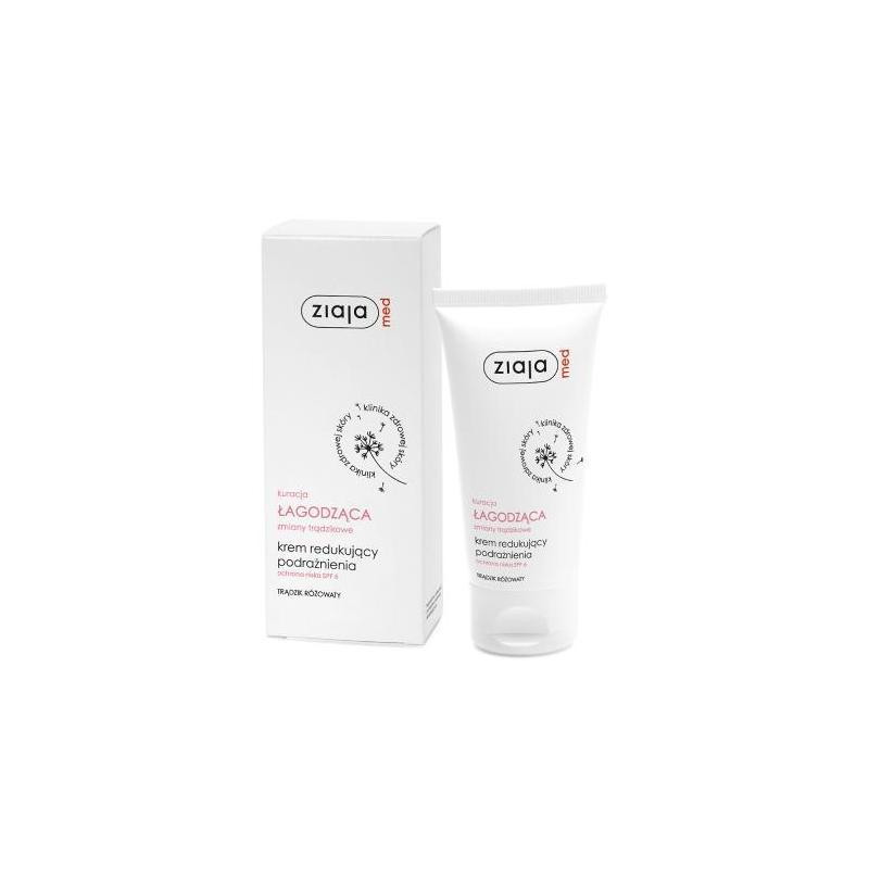 Ziaja Med Kuracja Łagodząca Krem na trądzik różowaty redukujący podrażnienia – chroni skórę przed promieniowaniem słonecznym, działa łagodząco w przypadku podrażnień. Kosmetyk nawilża i zmiękcza skórę, rozjaśnia cerę a także uszczelnia ścianki naczyń krwionośnych.