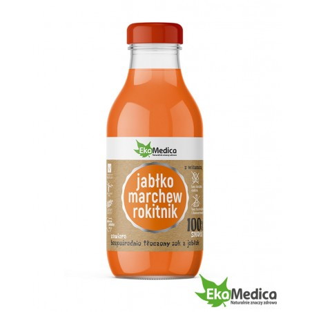 Suplement diety wyprodukowany z soku jabłkowego bezpośrednio tłoczonego, puree z marchwi i puree z owoców rokitnika z dodatkiem witaminy C. Pasteryzowany.