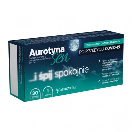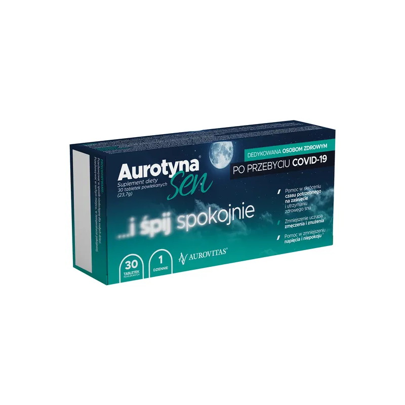Aurotyna® Sen to suplement diety w formie tabletek dedykowany osobom dorosłym. Formuła łączy w składzie melatoninę, dwa ekstrakty roślinne pozyskane z ziela melisy lekarskiej i szyszek chmielu 70 mg z witaminami (A, D, E, B6) z dodatkiem magnezu.