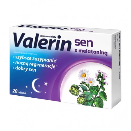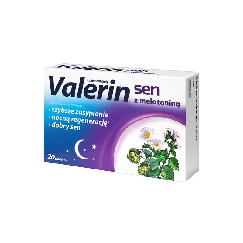 Aflofarm, Valerin Sen z melatoniną – suplement diety w postaci tabletek zawierający składniki wspomagające zdrowy sen i regenerację. Produkt przeznaczony dla osób dorosłych.