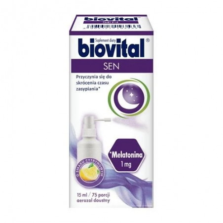 Biovital Sen to suplement diety w postaci aerozolu doustnego o smaku cytrynowym, zawierający melatoninę (1 mg w jednej dawce). Melatonina pomaga skrócić czas potrzebny na zaśnięcie oraz pomaga łagodzić subiektywne odczucia zespołu nagłej zmiany strefy czasowej. Postać aerozolu ułatwia stosowanie i dawkowanie produktu.