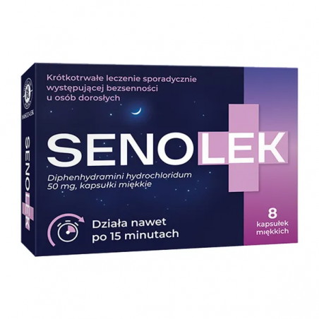 Przejściowo występujące zaburzenia snu mogą być spowodowane różnymi czynnikami, takimi jak: stres, stany chorobowe, niepokój, problemy osobiste lub zawodowe, zmęczenie związane ze zmianą strefy czasowej. Difenhydramina zawarta w leku Senolek powoduje skrócenie czasu zasypiania oraz zwiększa głębokość i poprawia jakość snu.