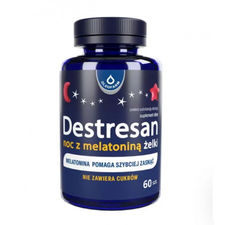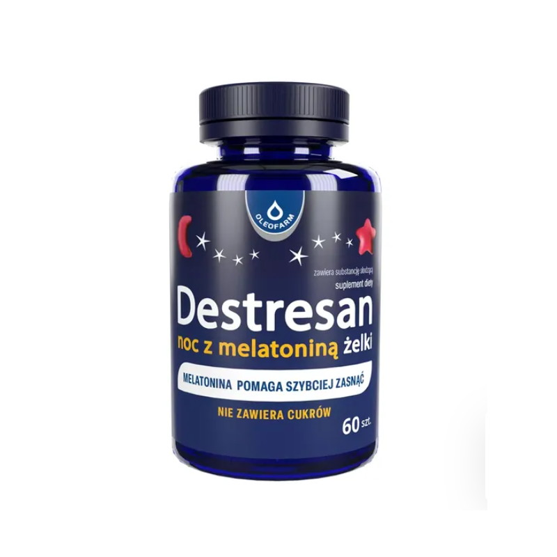 Oleofarm Destresan noc z melatoniną - to suplement diety w postaci żelek, który zawiera melatoninę, witaminę B6 i C, chmiel oraz melisę.