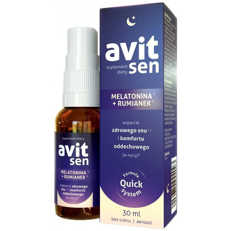 Avit sen - to suplement diety w formie areozolu, który zawiera formułę Quick System, czyli melatoninę oraz ekstrakt z kwiatów rumianku. Formuła Quick System pozwala na wchłanianie melatoniny już w jamie ustnej, przez błonę śluzową. Produkt przeznaczony dla osób dorosłych.