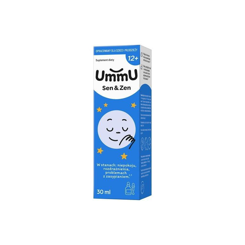 UmmU Sen & Zen 12+ to suplement diety w płynie o przyjemnym smaku, przeznaczony dla dzieci powyżej 12. roku życia. Zawiera ekstrakty roślinne oraz witaminę B6, które wspierają spokój, relaks i zdrowy sen.