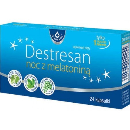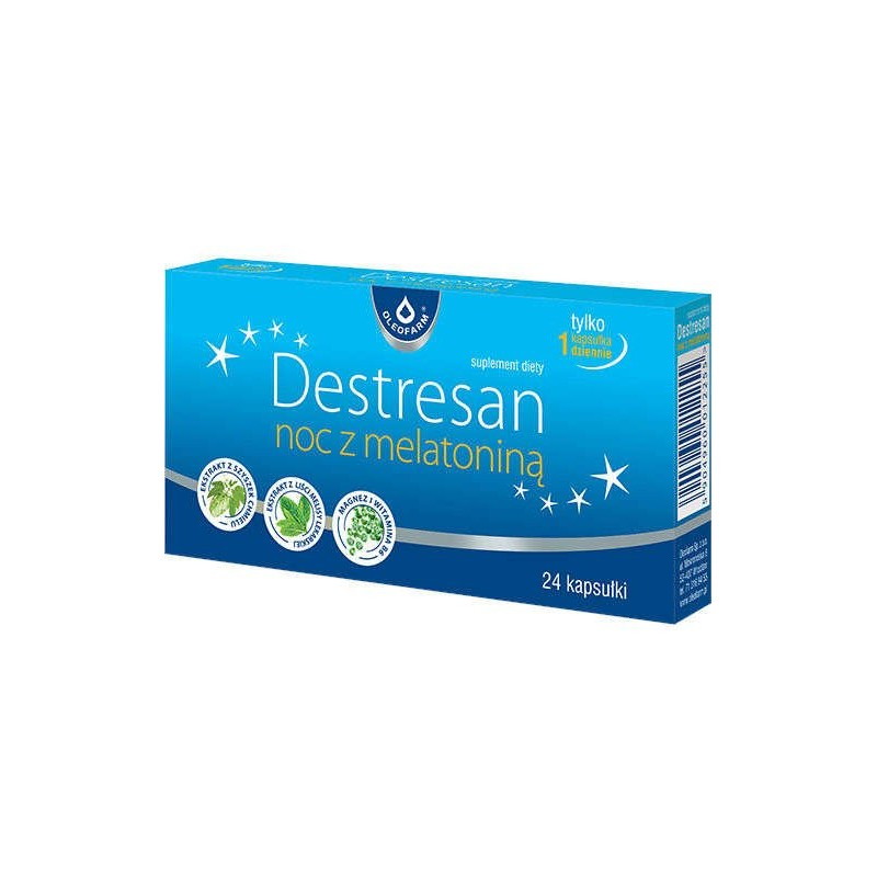 Suplement diety Destresan noc z melatoniną zawiera kompozycję ekstraktów roślinnych: z liści melisy lekarskiej i szyszek chmielu zwyczajnego wzbogaconą w magnez, witaminę B6 i melatoninę. W zalecanej porcji dziennej znajduje się 1mg melatoniny, ilość która spożyta krótko przed pójściem spać pomaga w skróceniu czasu potrzebnego na zaśnięcie. Melisa lekarska działa wyciszająco, a chmiel przynosi ukojenie i wspiera spokojny sen. Magnez i witamina B6 pomagają w prawidłowym funkcjonowaniu układu nerwowego.