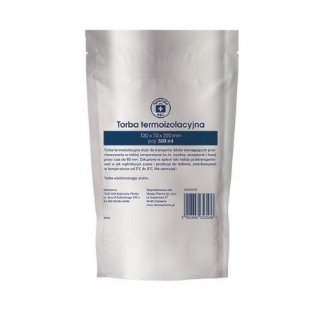 Torba termoizolacyjna służy do transportu leków wymagających przechowywania w niskiej temperaturze (m.in. insuliny, szczepionki i inne) przez czas do 60 min.