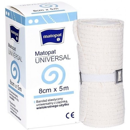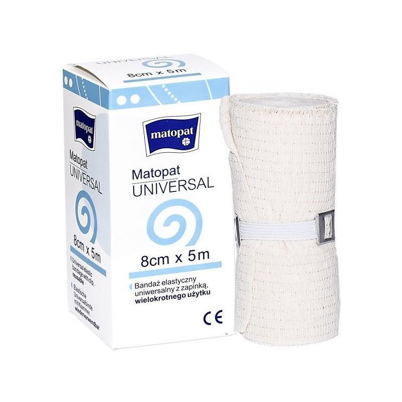 Bandaż elastyczny, uniwersalny Matopat Universal o wysokiej rozciągliwości stosowany m.in. do mocowania opatrunków na ranie czy jako opatrunek odciążający w profilaktyce i leczeniu urazów układu ruchowego.