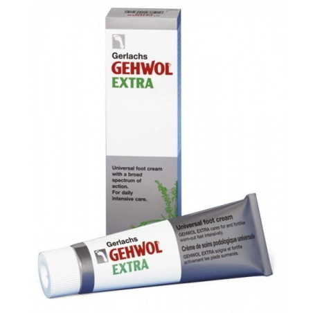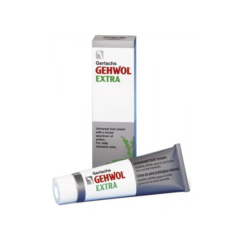 GEHWOL Extra Uniwersalny kosmetyk chroniący skórę stóp łagodzi uczucie zmęczenia stóp, można go stosować na odmrożenia, przy wzmożonej potliwości, przy nadmiernym rogowaceniu naskórka. Regularnie stosowany krem zapobiega powstawaniu modzeli.