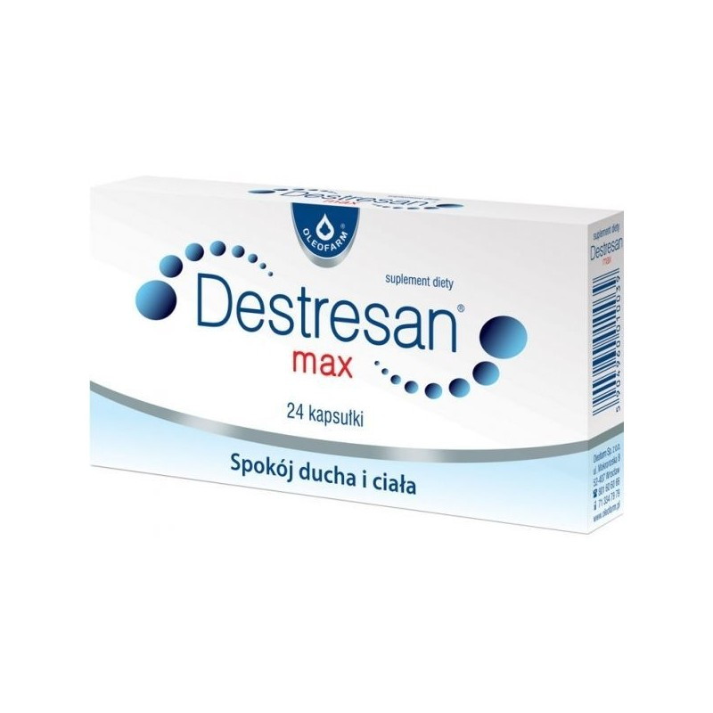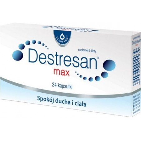Suplement diety Destresan Max to preparat zawierający kompozycję ekstraktów roślinnych (z liści melisy i korzenia różeńca górskiego), magnezu i witaminy B6. Ekstrakt z liści melisy ma efekt rozluźniający, pomaga w zasypianiu i ma wpływ na funkcje poznawcze i psychiczne. Ekstrakt z korzenia różeńca górskiego ma wpływ na sprawność poznawczą i umysłową, a także jest adaptogenem, który pomaga stymulować układ nerwowy. Magnez i witamina B6 pomagają w odpowiednim funkcjonowaniu układu nerwowego oraz w utrzymaniu prawidłowych funkcji psychologicznych.
