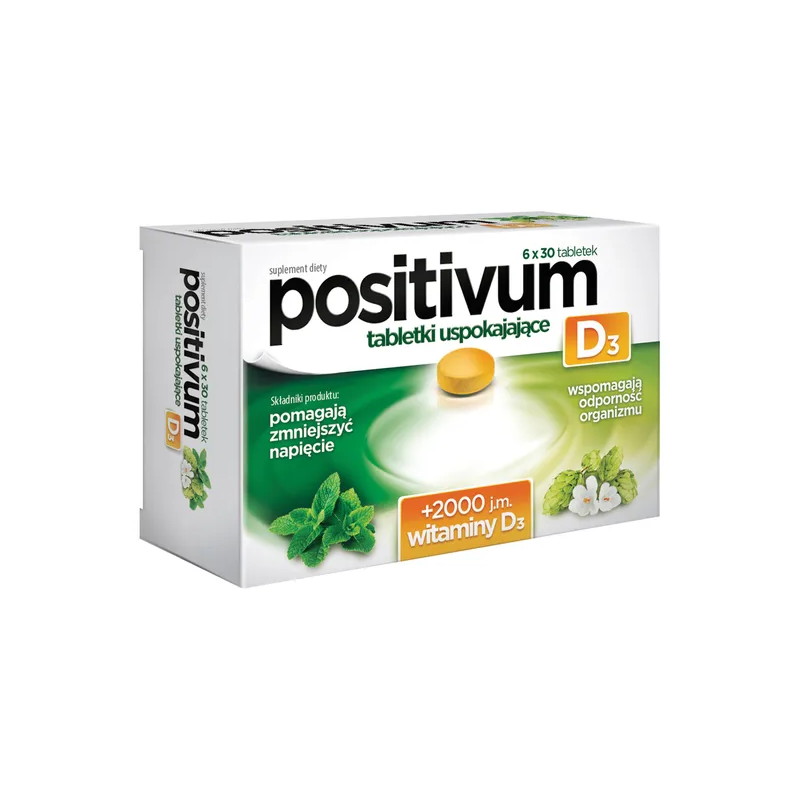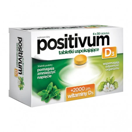 Tabletki uspokajające Positivum D3 to suplement diety łączący w składzie wyciągi roślinne z ziela melisy, szyszek chmielu i znamienia krokusa uprawnego uzupełnione o wysoka zawartość witaminy D i cynk. Zalecana dzienna porcja preparatu to 2000 j.m. witaminy D oraz 15 mg cynku.