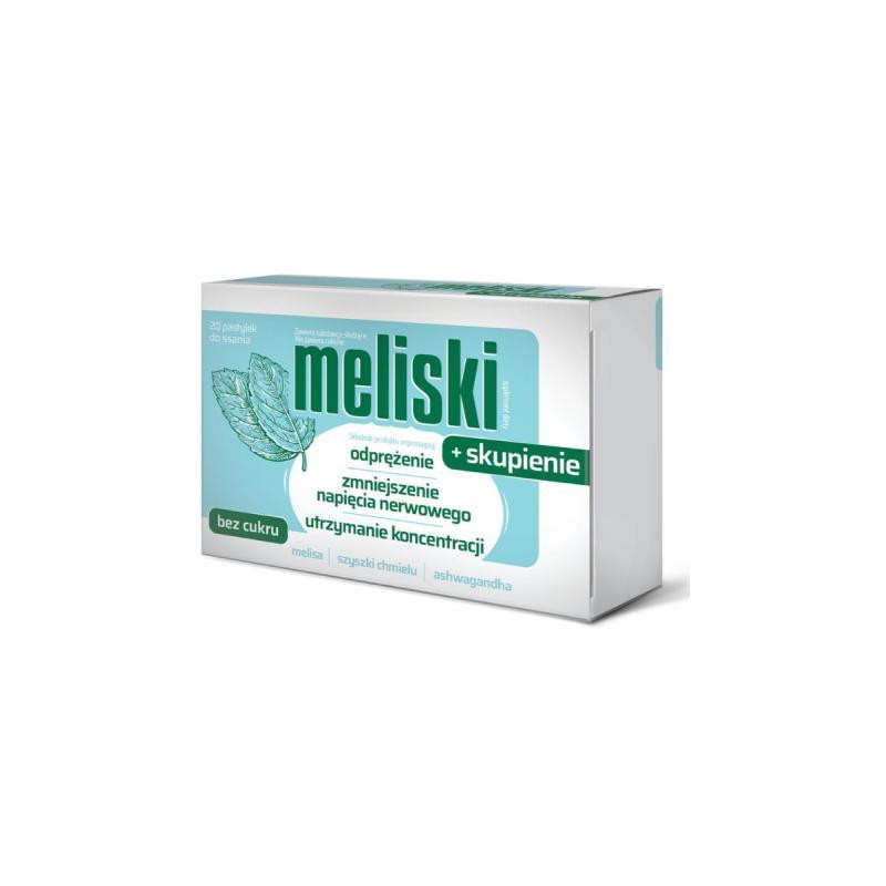 Meliski + skupienie - to suplement diety w formie pastylek do ssania, który zawiera wyciągi z ziela melisy, szyszek chmielu oraz korzenia ashwagandhy. Produkt przeznaczony dla dorosłych.