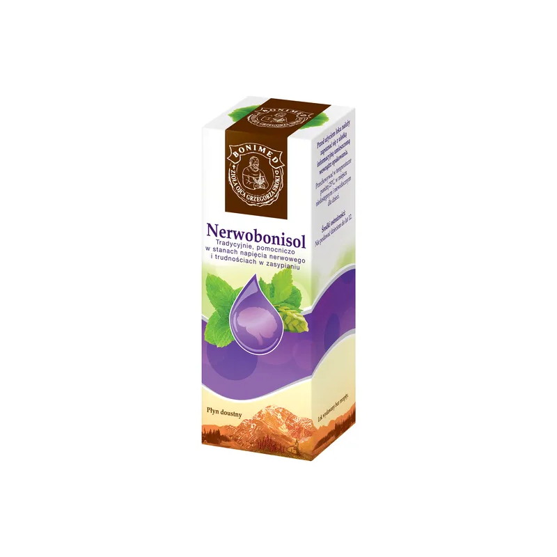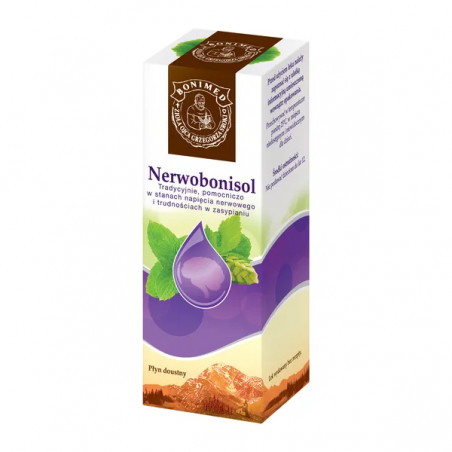 Nerwobonisol to lek w postaci ziołowego płynu doustnego, zawierającego: intrakt z melisy, nalewki z chmielu, rumianku, serdecznika, głogu oraz kozłka lekarskiego. Preparat stosuje się jako środek pomocniczy w stanach napięcia nerwowego i problemach z zasypianiem.