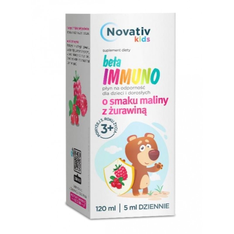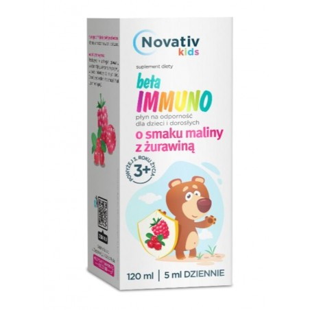 Novativ kids beta IMMUNO to suplement diety w płynie, o smaku maliny z żurawinę, którego składniki wspierają prawidłowe funkcjonowanie układu odpornościowego, w tym reakcje obronne organizmu. Produkt zawiera: beta-glukany z drożdży, L-argininę, witaminę C, witaminę D, witaminę B12 oraz cynk. Ze względu na zawarte w sobie składniki polecany jest zwłaszcza w okresach obniżonej odporności oraz w czasie zwiększonej podatności na przeziębienie i grypę. Występujący w nim veta-1,3/1,6-D-glukan, to naturalny polisacharyd uzyskiwany z drożdży Saccharomyces cerevisiae, który wykazuje właściwości biologiczne w licznych badaniach naukowych.