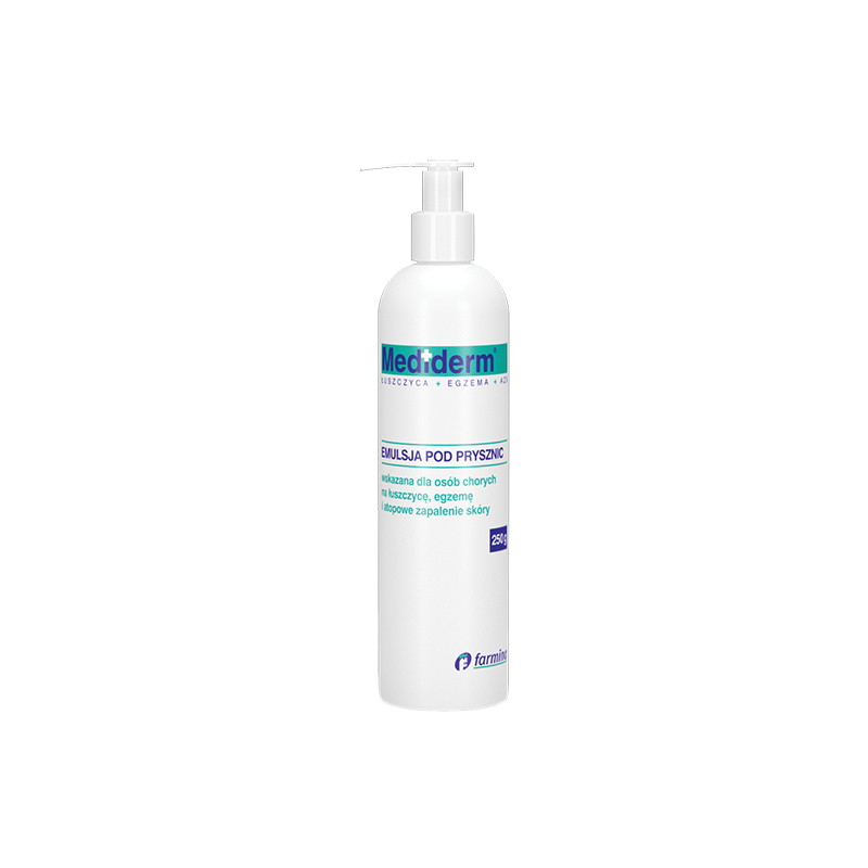 Mediderm shower jest niepieniącą się emulsją, posiadającą pH odpowiednie dla chorobowo zmienionej skóry, nie posiada substancji zapachowych i barwników. Ponadto produkt został przebadany mikrobiologicznie i dermatologicznie.