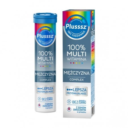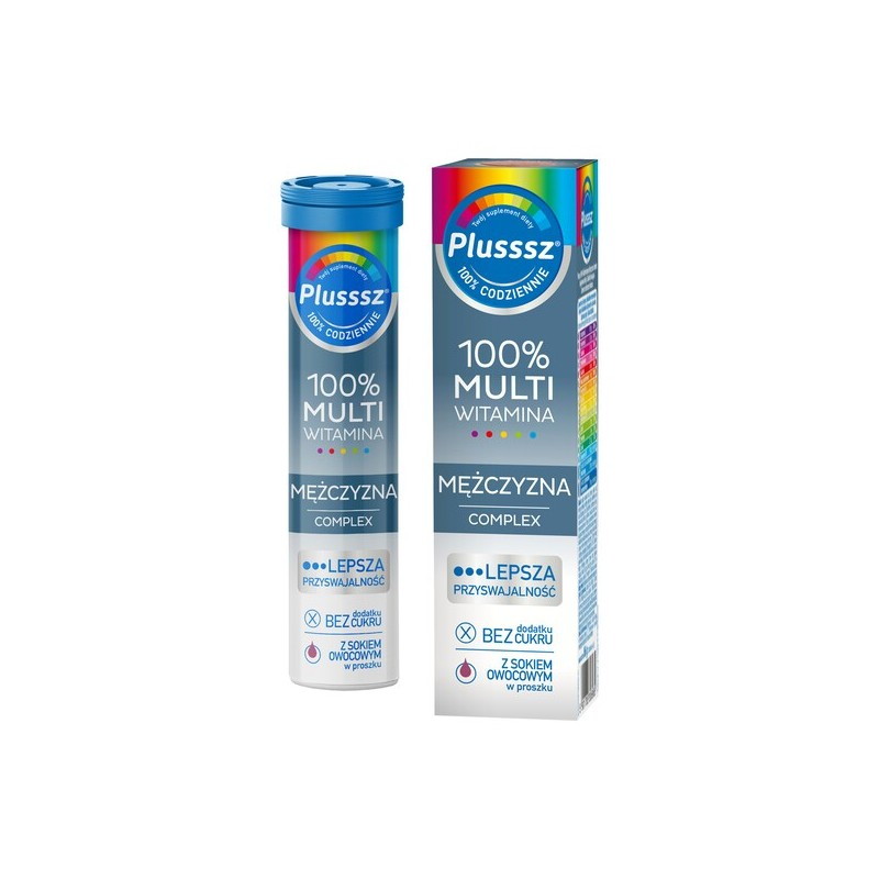 Plusssz 100% Multiwitamina Mężczyzna Complex - suplement diety zawierający składniki pochodzenia naturalnego ekstrakt z korzenia żeń-szenia oraz ekstrakt z ostrokrzewu paragwajskiego oraz kompleks 10 najważniejszych witamin. Produkt przeznaczony dla osób dorosłych.