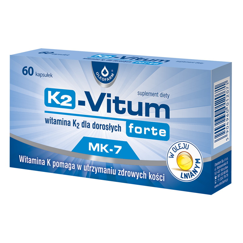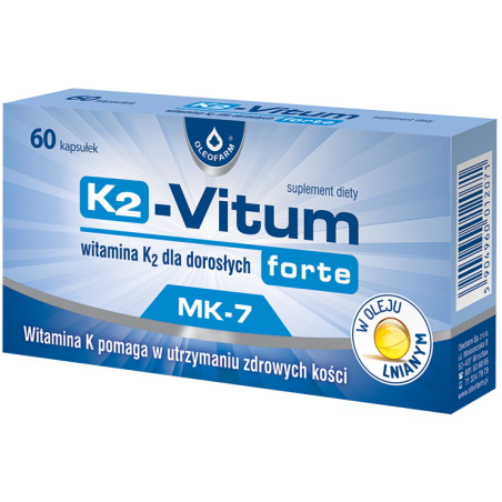Witamina K pomaga w utrzymaniu zdrowych kości. Tkanka kostna jest dynamiczną strukturą, która nieustannie podlega procesom przebudowy. Niektóre komórki kostne (osteoklasty) rozkładają tkankę kostną, uwalniając wapń, a inne (osteoblasty) tworzą nową tkankę kostną poprzez wbudowywanie m.in. wapnia do kości. Ważne jest zachowanie równowagi pomiędzy tymi dwoma procesami, szczególnie dlatego, że wraz z wiekiem następuje nasilenie procesu rozkładu tkanki kostnej. Preparat K2-Vitum forte zawiera w swoim składzie naturalną witaminę K2 – menachinon-7 (MK-7) otrzymywaną w wyniku biofermentacji z udziałem mikroorganizmów Bacillus subtilis natto.