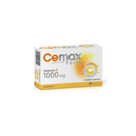 Suplement diety CeMax Forte zawiera witaminę C, tabletki o przedłużonym uwalnianiu. Witamina C pomaga w prawidłowej produkcji kolagenu w celu zapewnienia prawidłowego funkcjonowania naczyń krwionośnych, pomaga w prawidłowym funkcjonowaniu układu odpornościowego, przyczynia się do zmniejszenia uczucia zmęczenia i znużenia, pomaga w ochronie komórek przed stresem oksydacyjnym oraz zwiększa przyswajanie żelaza.