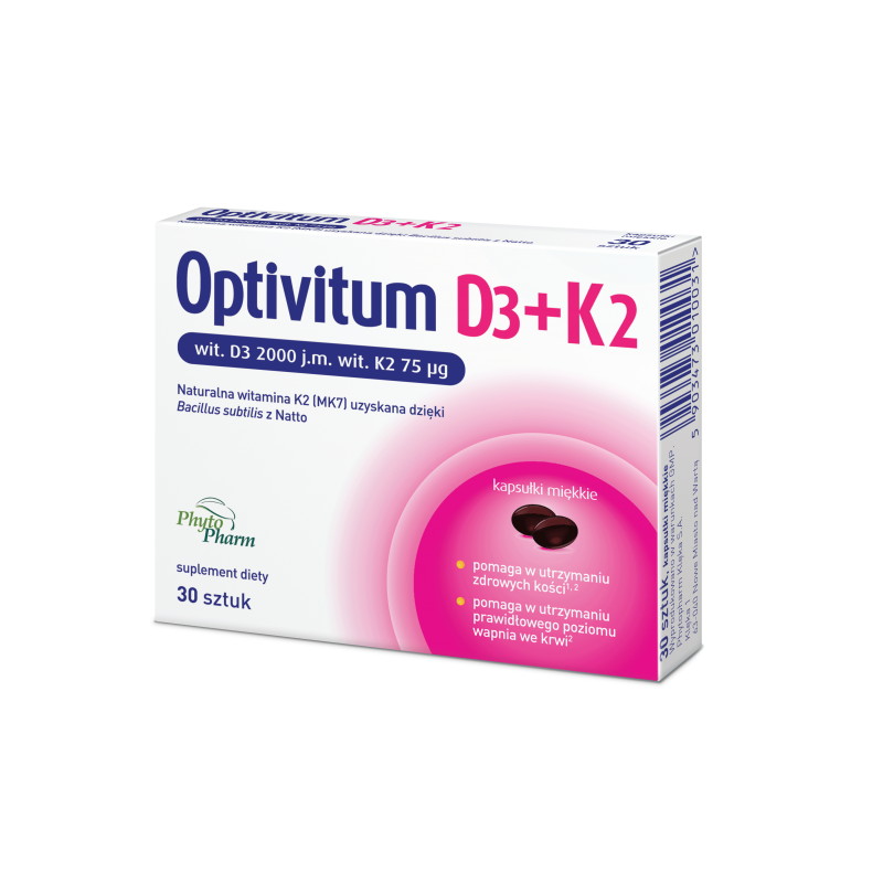 Witamina D3 - 2000 j.m., naturalna witamina K2 (MK-7) uzyskana dzięki Bacillus subtilis z Natto - 75 µg.