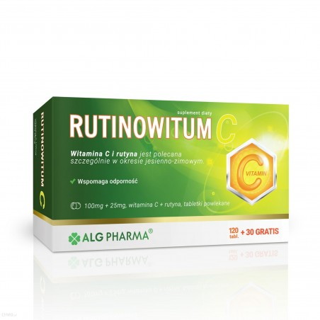 Rutinowitum C jest to suplement diety zawierający witaminę C oraz rutynę. Witamina C wspomaga prawidłowe funkcjonowanie układu odpornościowego, neutralizuje wolne rodniki. Rutyna jest naturalnym związkiem pochodzenia roślinnego, wzmacnia i uszczelnia ściany naczyń krwionośnych, dziąseł, skóry i zębów.