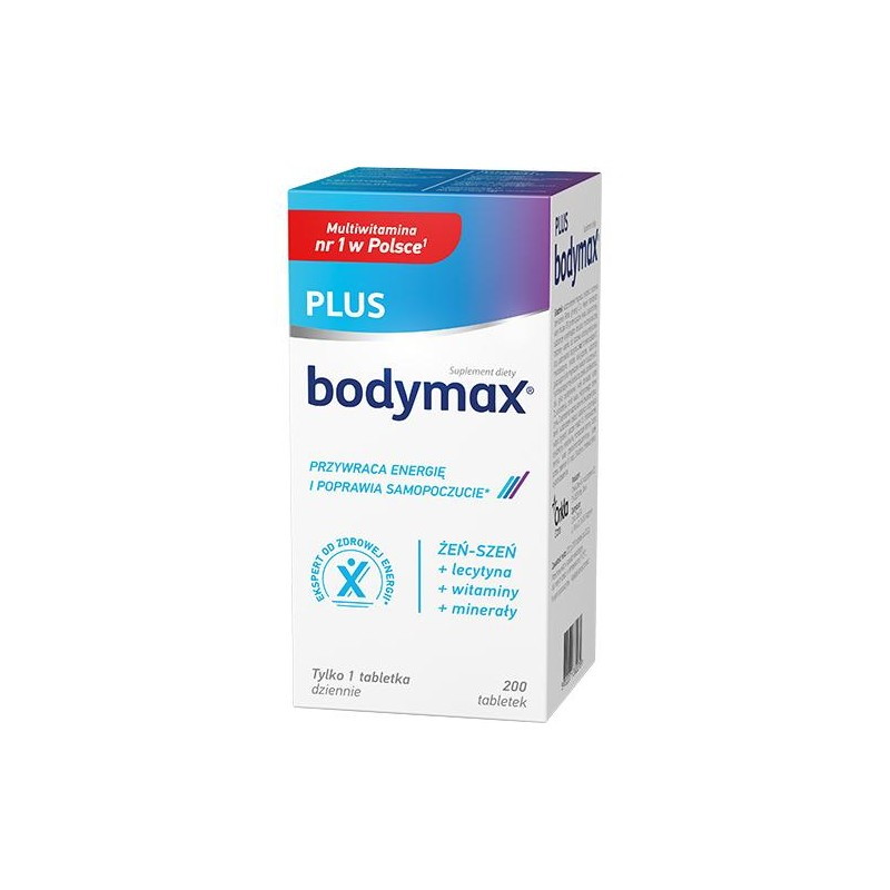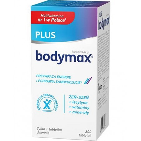 Bodymax Plus to połączenie wyciągu z żeń-szenia oraz witamin i minerałów. Został stworzony dla osób aktywnych na co dzień. Żeń-szeń zmniejsza zmęczenie i przywraca energię, wspomaga sprawność fizyczną i umysłową. Magnez, niacyna oraz witaminy B6 i B12 przyczyniają się do zmniejszenia uczucia zmęczenia i znużenia.