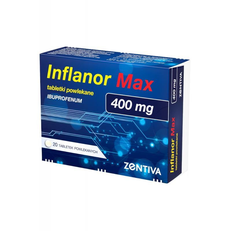 Inflanor Max to lek dla dorosłych i młodzieży powyżej 12. roku życia, przeznaczony do krótkotrwałego, objawowego leczenia łagodnego do umiarkowanego bólu, migreny, pierwotnego bolesnego miesiączkowania oraz gorączki. Zawiera 400 mg ibuprofenu, który działa przeciwbólowo, przeciwzapalnie i przeciwgorączkowo.