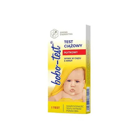 BOBO - TEST płytkowy - to szybki i łatwy do przeprowadzenia test ciążowy do domowego użytku. Wyniki testu pojawiają się w ciągu 3-5 minut po jego wykonaniu. Test można stosować już po 10 dniach po stosunku. Jeśli nie minął jeszcze pierwszy dzień spodziewanej miesiączki do przeprowadzenia testu należy użyć pierwszego porannego moczu. Jeżeli minął pierwszy dzień spodziewanej miesiączki test można przeprowadzić o każdej porze dnia. Zawartość opakowania: instrukcja użycia, płytka testowa, pipetka.