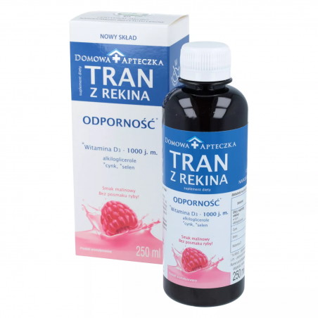 Domowa Apteczka Tran z Rekina o smaku malinowym to suplement diety w płynnej postaci odpowiedni do stosowania u dzieci powyżej 3 roku życia i osób dorosłych.