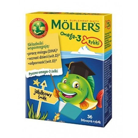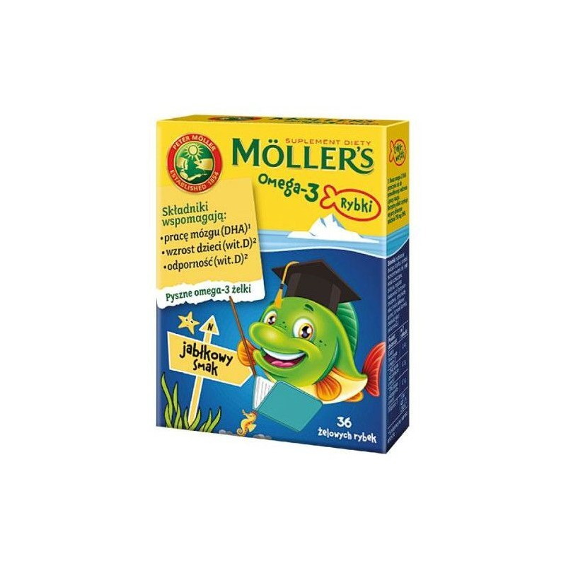 Moller's Omega-3 Rybki to suplement diety dla dzieci powyżej 3 roku życia i dorosłych w postaci żelowych rybek o jabłkowym smaku. Preparat zawiera kwasy omega-3 - kwas dokozaheksaenowy (DHA) i kwas eikozapentaenowy (EPA) oraz witaminę D.