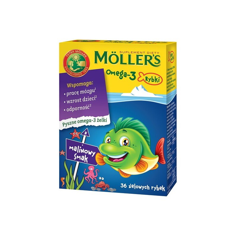 Moller's Omega-3 Rybki - suplement diety, zawierający składniki, które wspomagają pracę mózgu i rozwój dziecka. Produkt przeznaczony dla dzieci powyżej 3 roku życia.
