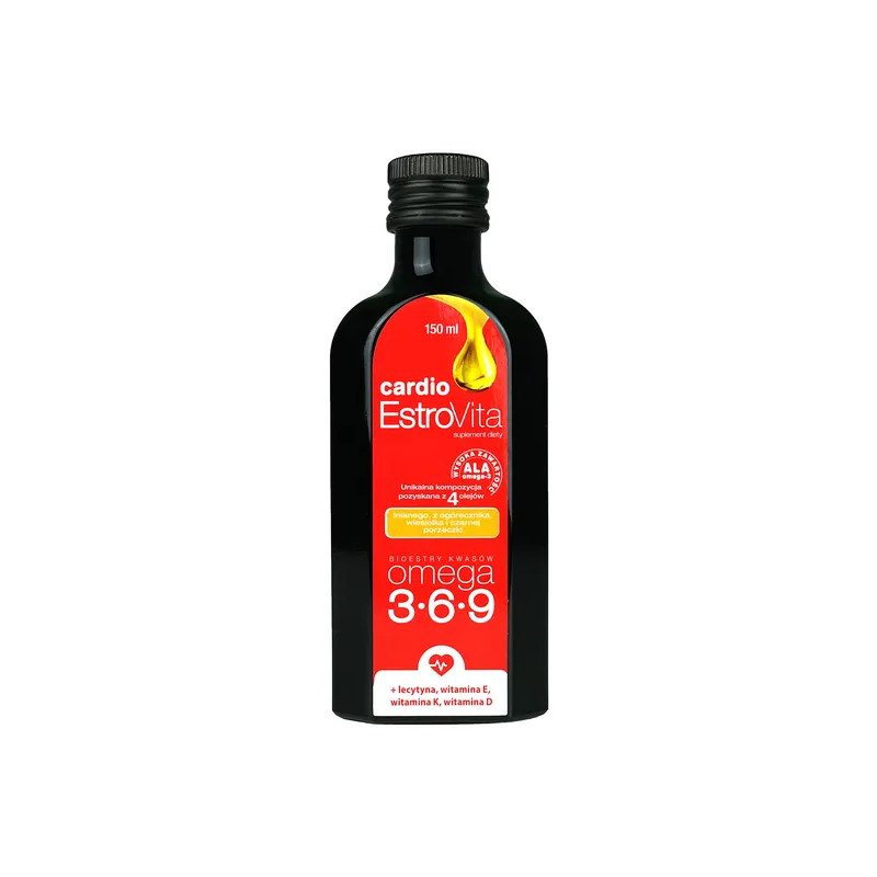 EstroVita Cardio - suplement diety w formie płynu, który zawiera kompozycję trzech kwasów omega oraz lecytynę i witaminy. Roślinne kwasy tłuszczowe omega-3, -6, -9 zostały wyizolowane z mieszaniny 4-ech olejów roślinnych (lnianego, z wiesiołka, ogórecznika, czarnej porzeczki) i występują w płynie jako monocząsteczki (estrów etylowych). Produkt przeznaczony dla osób dorosłych.