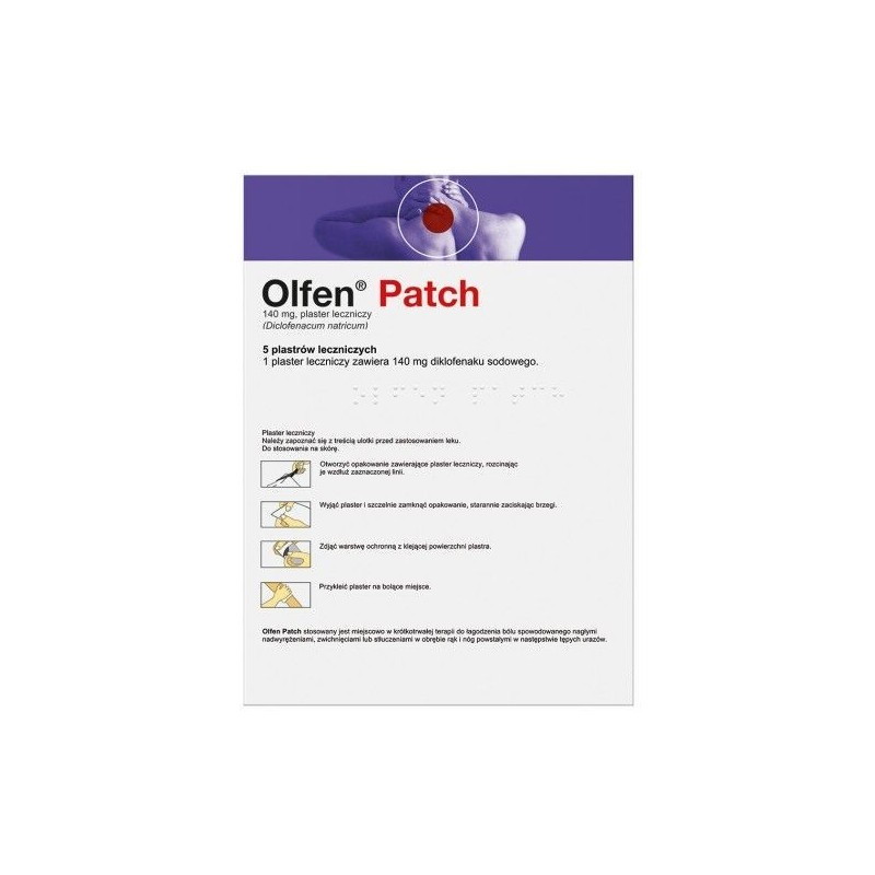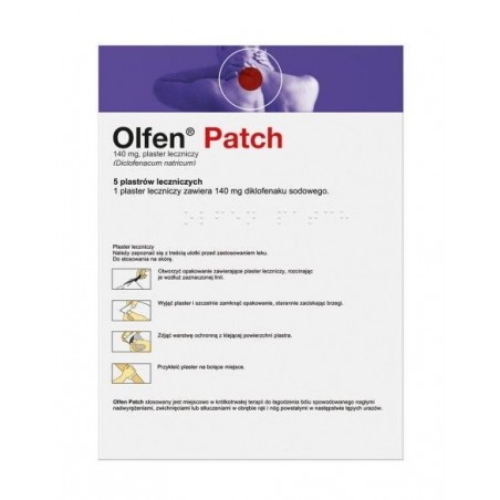 Olfen Patch to produkt leczniczy w postaci plastrów do stosowania w bólu towarzyszących nadwyrężeniom, zwichnięciom, stłuczeniom, urazom.