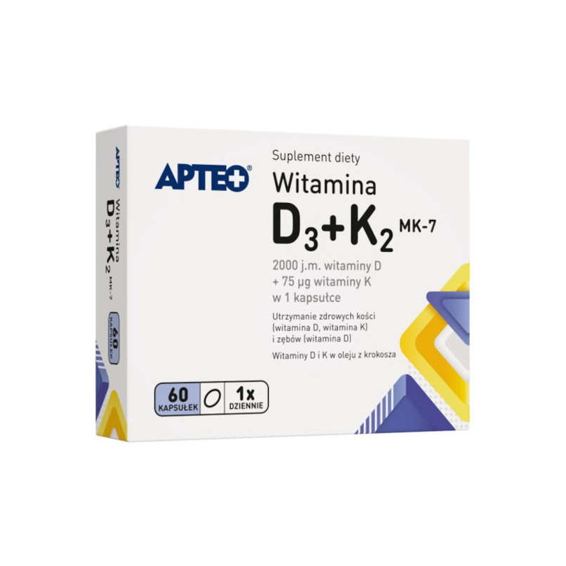 Suplement diety Apteo Witamina D3+K2 MK-7 przeznaczony do stosowania jako uzupełnienie codziennej diety w witaminy – D i K. Preparat dla osób dorosłych.