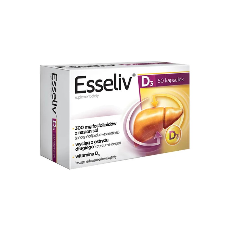 Esseliv D3 - suplement diety wspierający zdrowie wątroby. Kapsułki zawierają fosfolipidy sojowe, wyciąg z ostryżu długiego oraz witaminę D. Produkt przeznaczony dla osób dorosłych.